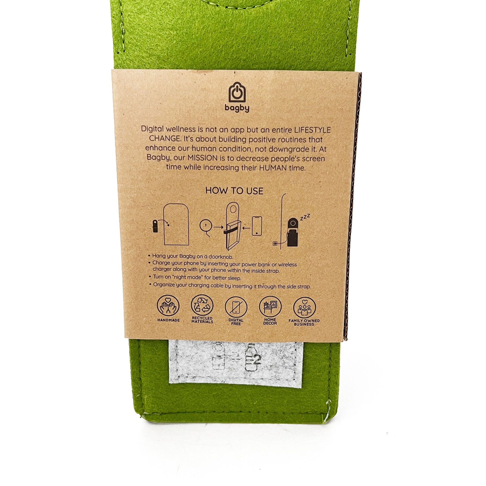 Bagby ORIGINAL is the world's first sleeping bag for your phone mindfully designed to help you sleep away from your phone and wake up gently and distraction-free. It hangs on your bedroom doorknob and features an inside strap to charge your phone while you are sleeping. It's a convenient and effective way to remember not to bring your phone to bed!