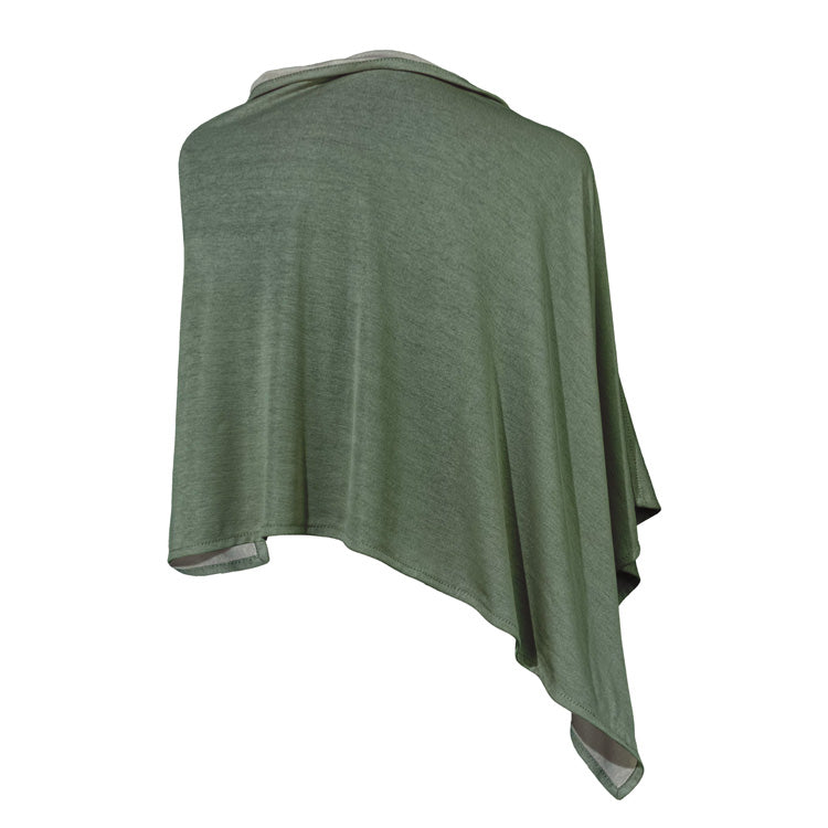 This versatile Green Moss and Silver Cotton Double Knit Poncho is highly functional yet cozy and comfortable. Shades of grey and white in a speckled blend on one side, and silver on the other, it is made from a 42% silver and 53% cotton double knit fabric blend, woven with 99.99% ionically plated pure silver thread. Flattering, this poncho is a perfect everyday accessory, great for sporty outings to elegant evenings.